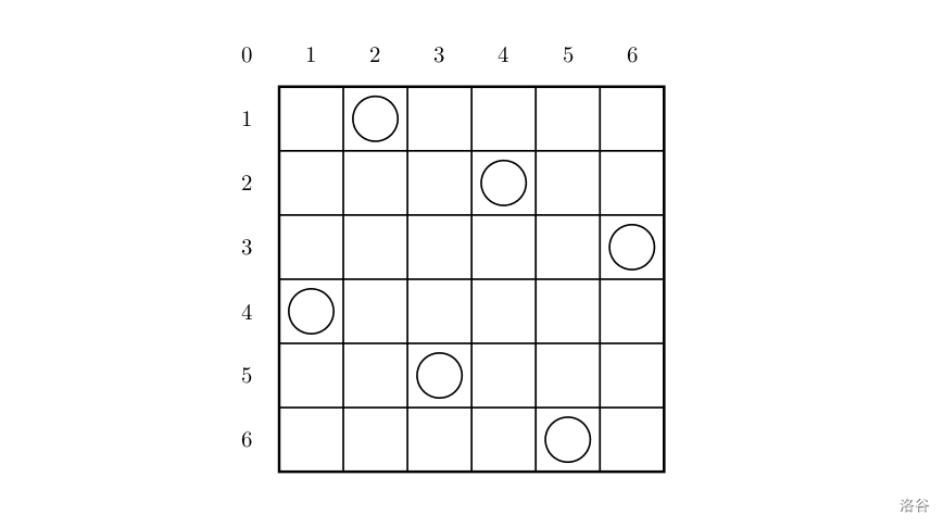 上面的布局可以用序列 $2\ 4\ 6\ 1\ 3\ 5$ 来描述,第 $i$ 个数字表示在第 $i$ 行的相应位置有一个棋子,如下: